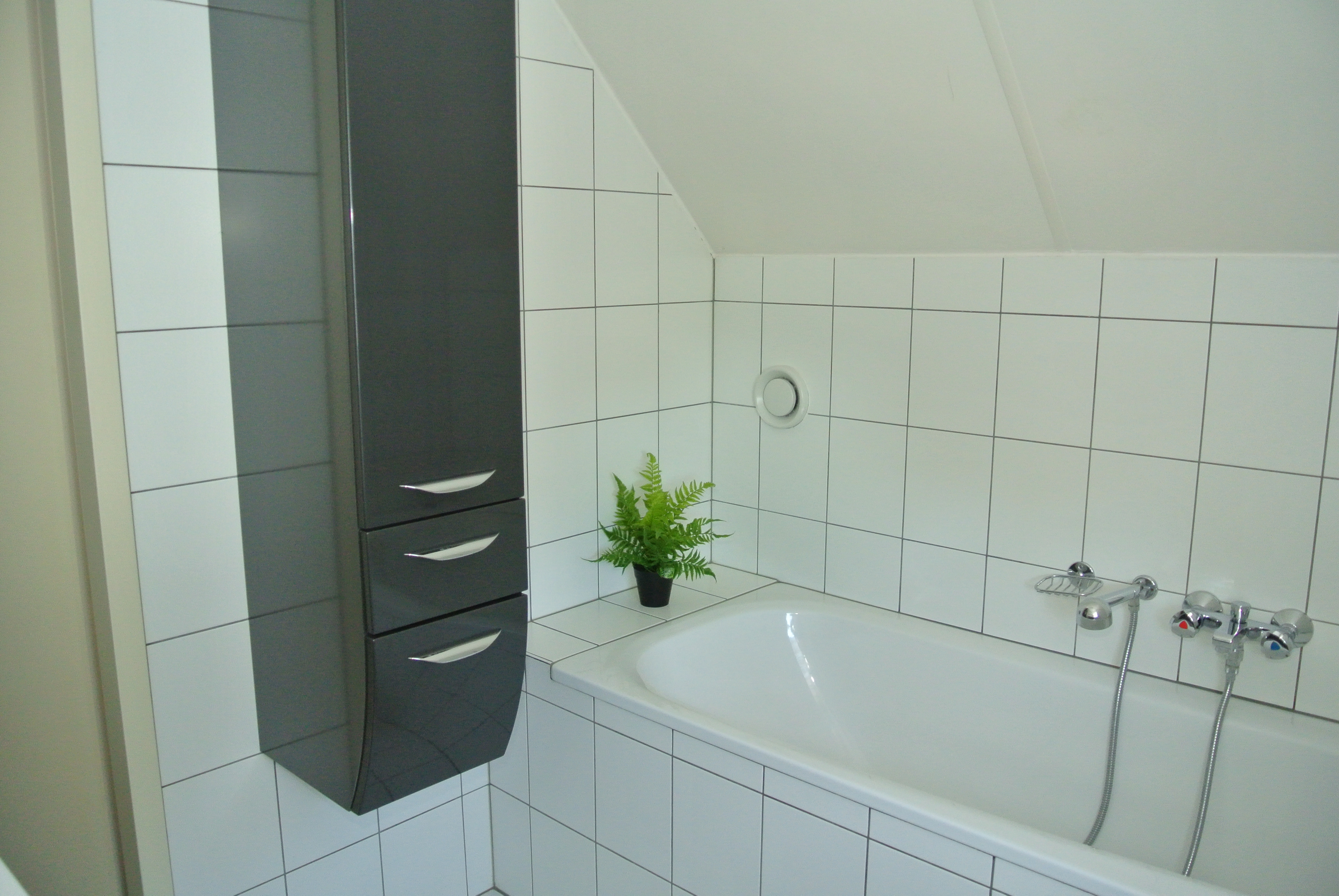 Ebenfalls im Obergeschoss befindet sich das moderne Bad. Es ist mit Wanne und Toilette ausgestattet.
