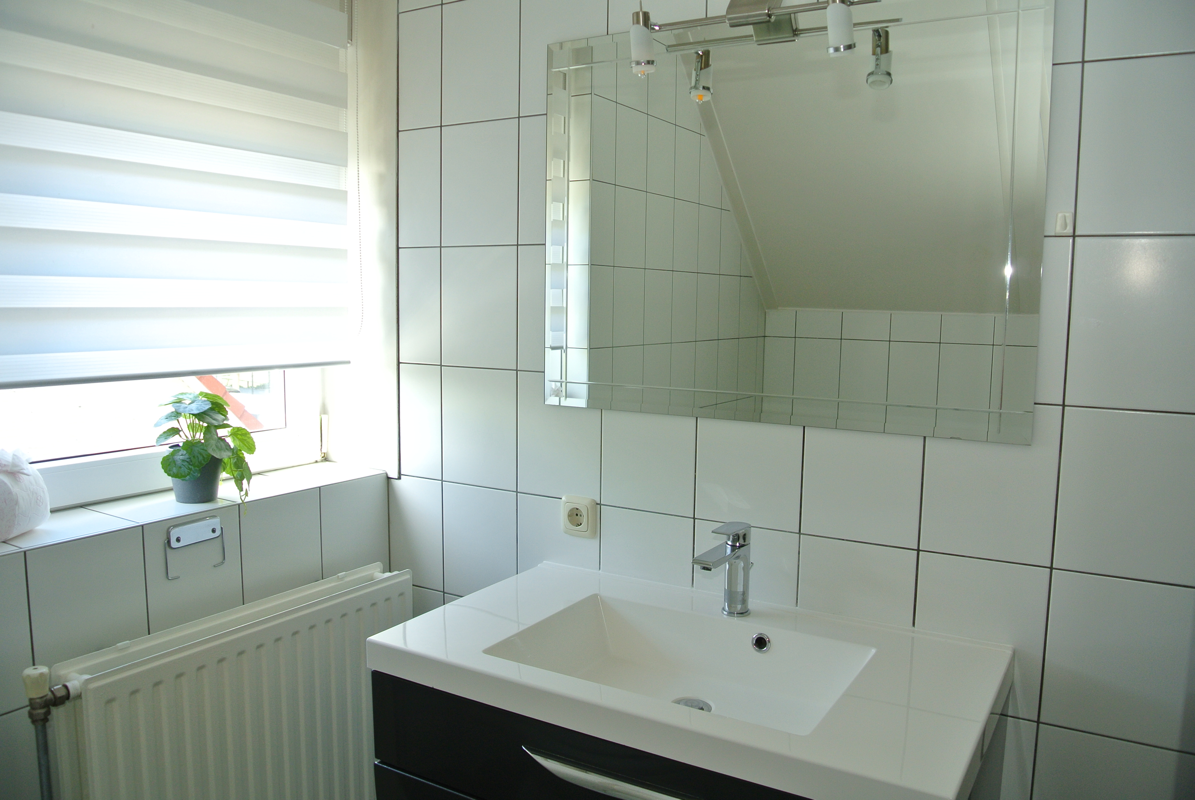 Ook de moderne badkamer bevindt zich op de bovenverdieping. Deze is voorzien van een ligbad en toilet.